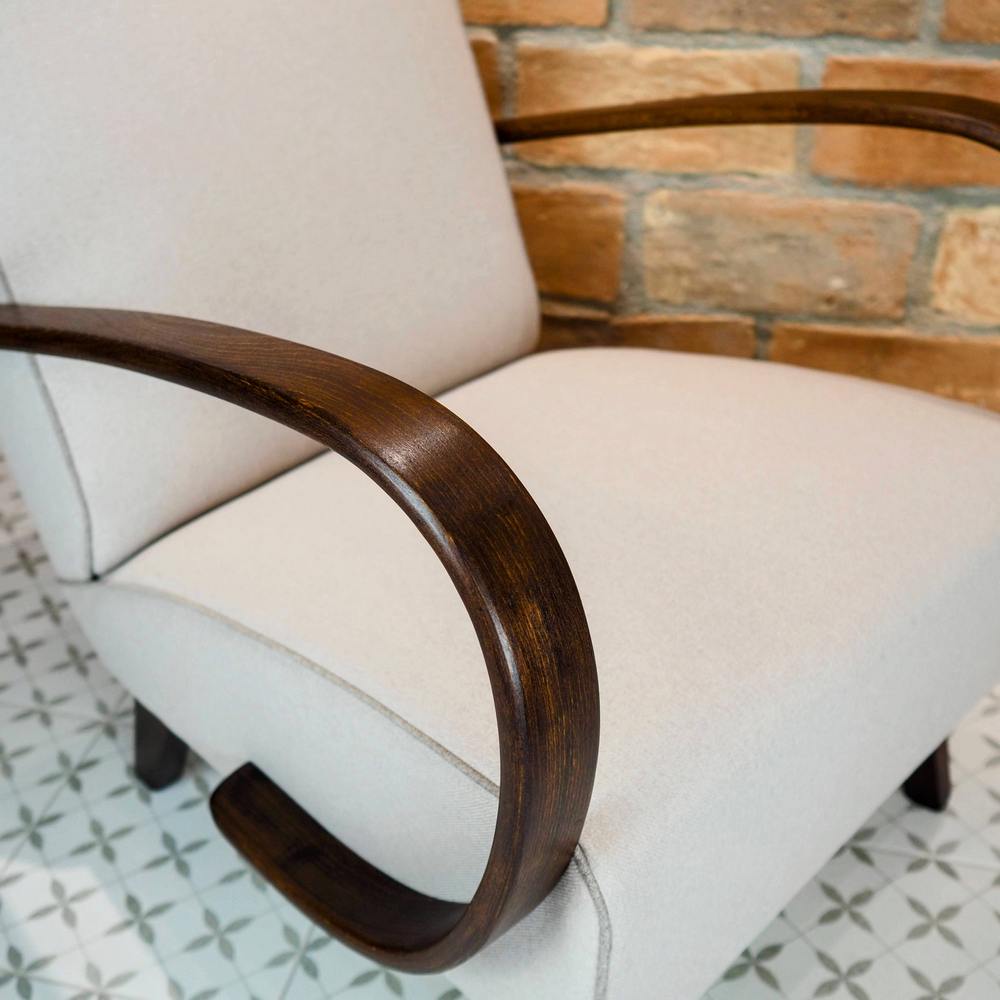 Křeslo od designéra Jindřicha Halabaly prošlo kompletní renovací – staré čalounění bylo odstraněno až na dřevěnou kostru a pružiny nově vyvázány. Čalouněné bylo do kvalitní potahové látky s vysokým podílem bavlny (75 % bavlna, 25 % polyester) s výrazným vzorem, díky kterému křeslo krásně vynikne v moderním interiéru a stane se solitérním prvkem, který zaujme na první pohled.